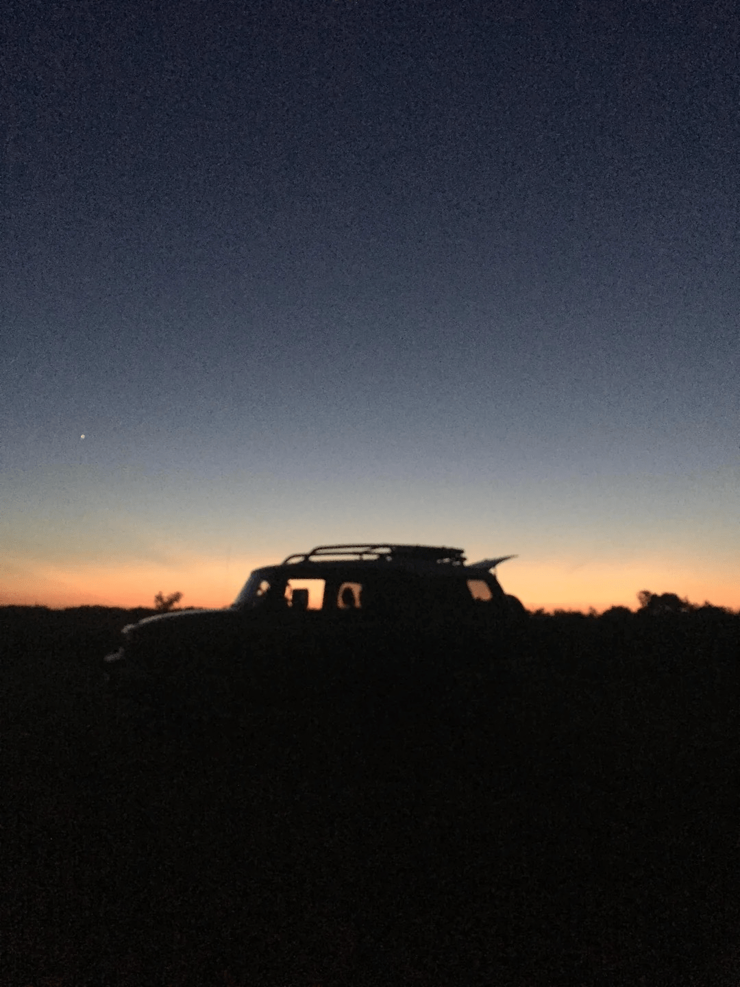 The photograph from that evening is blurry. The FJ is soft around the edges, its roof rack a dark grid against the burning sky. The back window hangs open in the silhouette, the way it always did when the dogs were along. Venus is there, small and bright, upper left, just where it was.